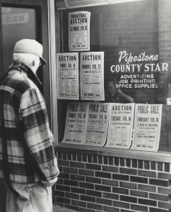 Auction Ads Man reading auction notices in the window of the Pipestone County Star building on South Hiawatha Avenue. Like Loading...